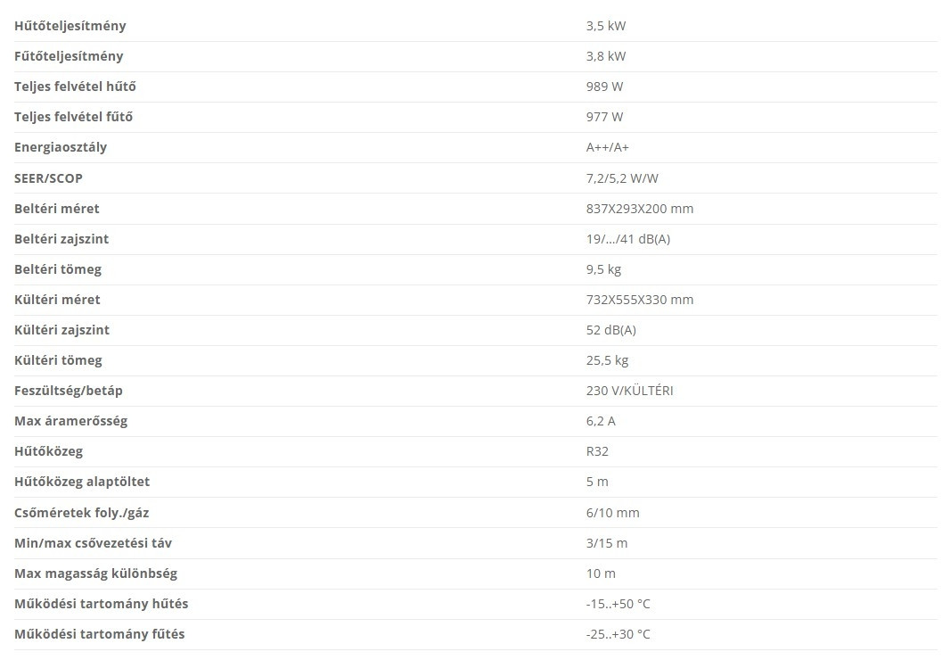 • Hűtő teljesítmény : 3,5 kW